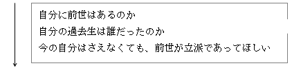 前世のことは世の中でもよく言われますが、前世が立派であってほしいと思うのは、ほとんどの人がそうだと思います。私もいいことを言われたら、やっぱり心をくすぐられると思いますが、よく考えたら、それが今の人生には関係ないし、今の目的(霊的成長、カルマ清算)が大切なことなので前世ブームなどに惑わされないようにしなければと思います。それぞれの立場での問題を解決することで、類魂全体の向上に貢献するように、コツコツとスピリチュアリズムの実践が必要だと、今回の再生の勉強で感じました。(60代 女性)